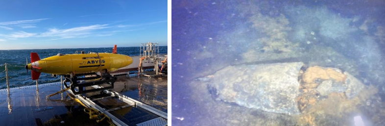 Links: AUV Abyss an Deck der ALKOR (links) und chemisches Kampfmittel im Bornholmbecken (rechts)