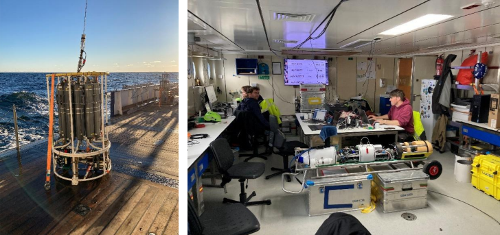 Rechts: CTD an Deck der ALKOR (links) und ein Blick ins Trockenlabor auf der ALKOR als AUV Zentrale (rechts)