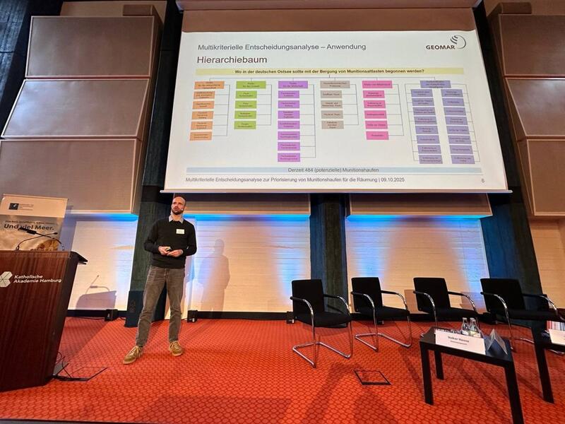 Am 08. & 09.10.2025 fand in Hamburg das jährliche Meeresumwelt-Symposium 2025 des Bundesamts für Seeschifffahrt und Hydrografie statt. Neben Themenblöcken zur Windenergie auf See und zur nachhaltigen Schifffahrt stand unter anderem das Thema Munition im Meer auf der Agenda. CONMAR wurde durch Torsten Frey vom GEOMAR vertreten. In seinem Vortrag über die multikriterielle Entscheidungsanalyse zur Priorisierung von Munitionshaufen für die Räumung präsentierte er Projektergebnisse und empfahl, wo mit der Räumung begonnen werden sollte. Zusammengefasst wurden die neuesten Erkenntnisse zudem in einem Interview mit dem Deutschlandfunk (https://www.deutschlandfunk.de/munition-im-meer-altlasten-vom-2-weltkrieg-werden-geborgen-100.html). Das große Interesse sowie das fundierte Wissen des politischen Besuchs zur Problematik der Munitionsaltlasten unterstreichen die zunehmende Relevanz des Themas auf bundespolitischer Ebene. Die Beseitigung von Munitionsaltlasten in Nord- und Ostsee ist im Koalitionsvertrag der Bundesregierung als gesamtstaatliche Aufgabe verankert – ein starkes Signal für konkretes Handeln.